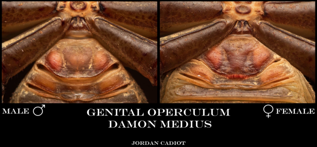 Le plus compliqué dans la reproduction des Damon medius est le sexage. Si vous arrivez à voir le dessous de votre Damon medius voici une photo du comparatif mâle / femelle.