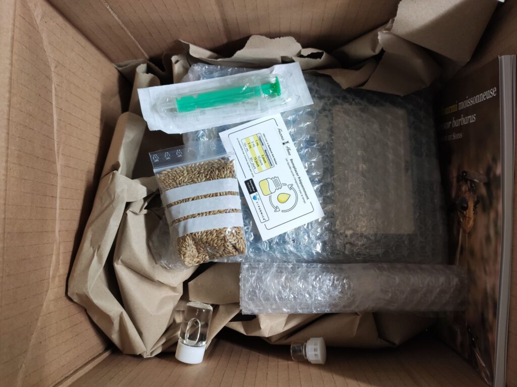 Si vous avez reçu une reine avec des ouvrières, le mieux étant de les garder dans leur tube à essai et de les nourrir directement dedans. Si c’est impossible, installez le tube dans une petite boîte à laquelle vous appliquez de l’anti-évasion tout autour, vous placez le tube dedans et vous allez pouvoir les nourrir.