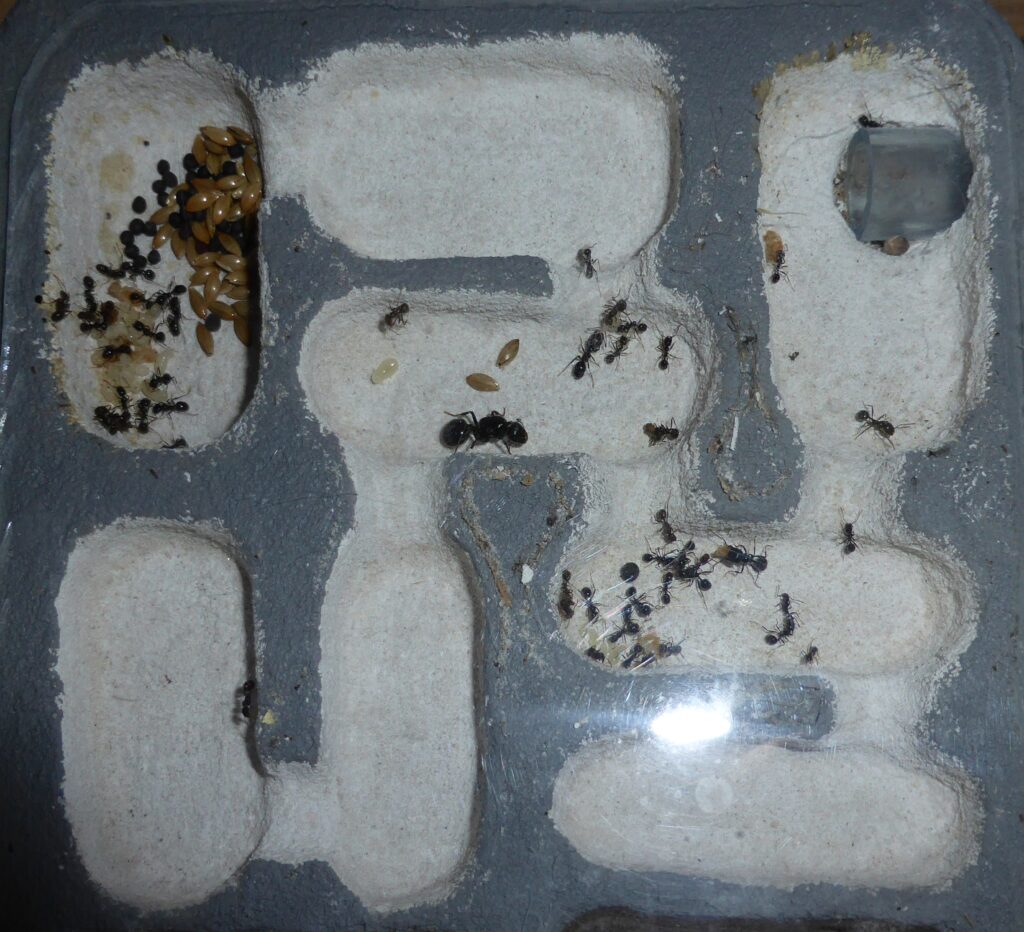 - Un nid : C’est l’endroit où vont vivre les fourmis, cette espèce fait des réserves de graines il lui faudra donc des grosses alvéoles sèches avec beaucoup de place et d’autres humides pour le couvain, on utilise en général 30 à 50 % de la surface du nid humide. Il faut éviter de fournir un nid trop grand au départ, il est préférable d’agrandir au fur et à mesure. En quelques années la colonie peut atteindre une dizaine de milliers d’individus donc il ne faut pas se laisser surprendre malgré que le développement soit assez prévisible n’étant pas des plus explosifs.